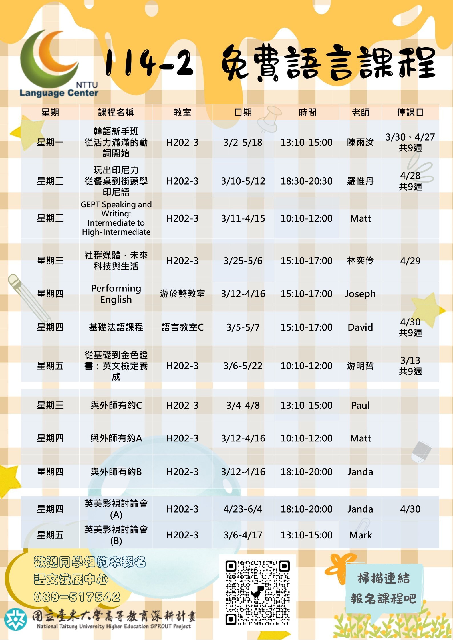 【語文發展中心】114-2「免費語言課程」feat.高教深耕計畫,開始報名囉,歡迎踴躍報名參加